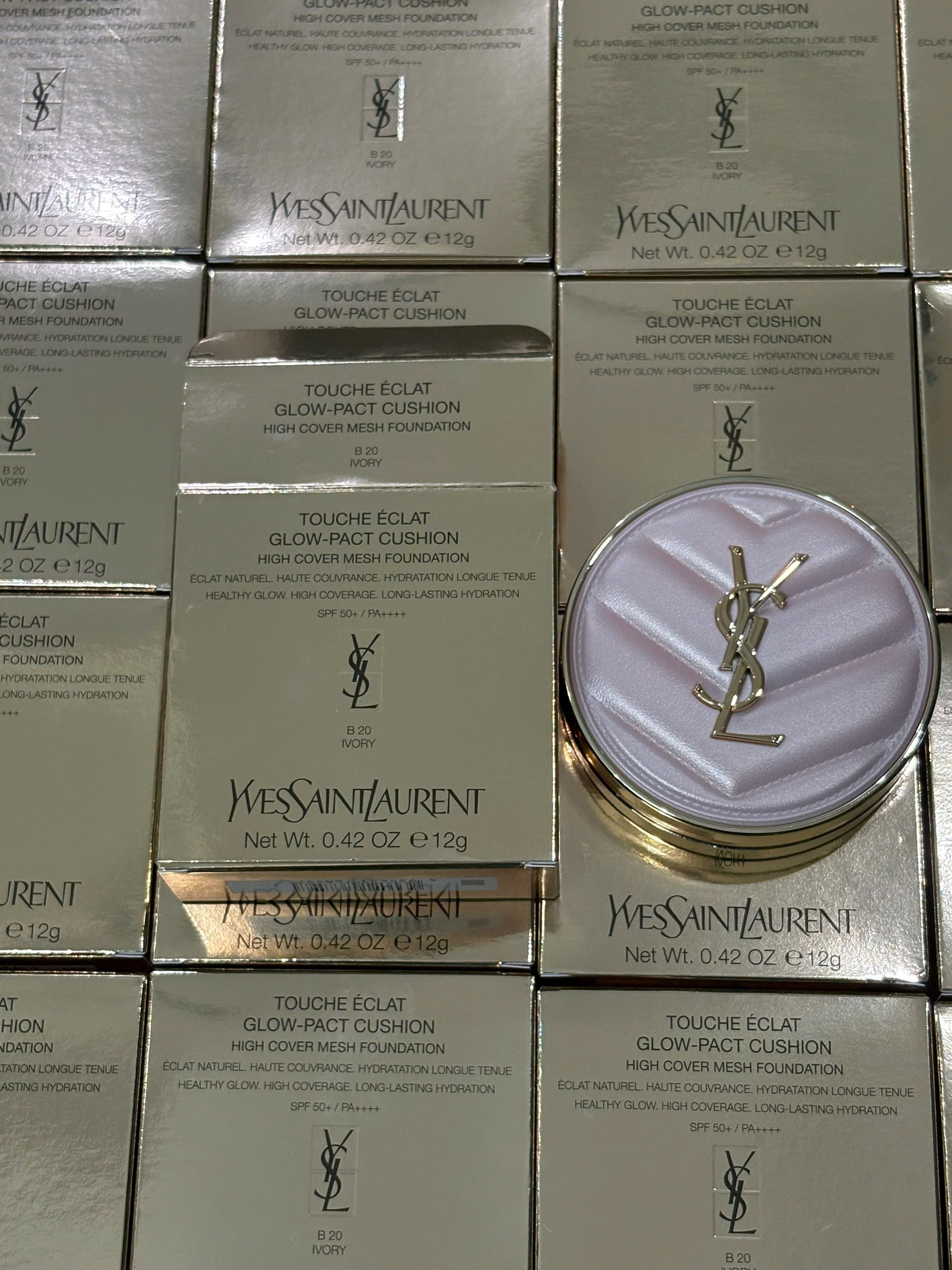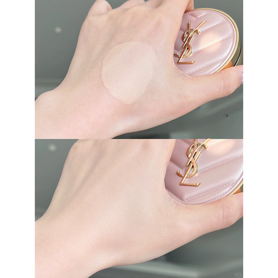 YSL Touche Éclat Glow-Pact Cushion là sản phẩm nền dạng lưới cao cấp với vỏ da hồng, mang lại lớp nền mỏng nhẹ, che phủ hoàn hảo và dưỡng ẩm đến 24 giờ. Công thức kết hợp giữa các thành phần tự nhiên và công nghệ hiện đại giúp làm sáng đều màu da, tạo hiệu ứng căng bóng tự nhiên.