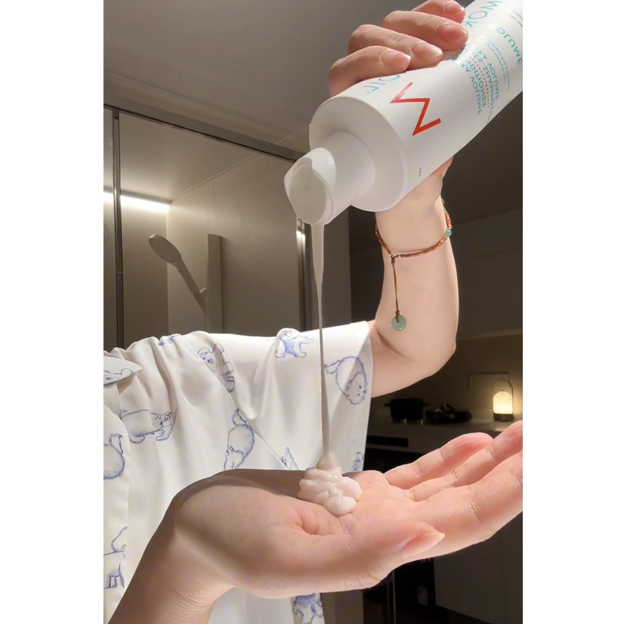 - Tiếp tục dùng dầu xả, thoa từ giữa thân tóc đến ngọn, để 1–2 phút rồi xả lại.