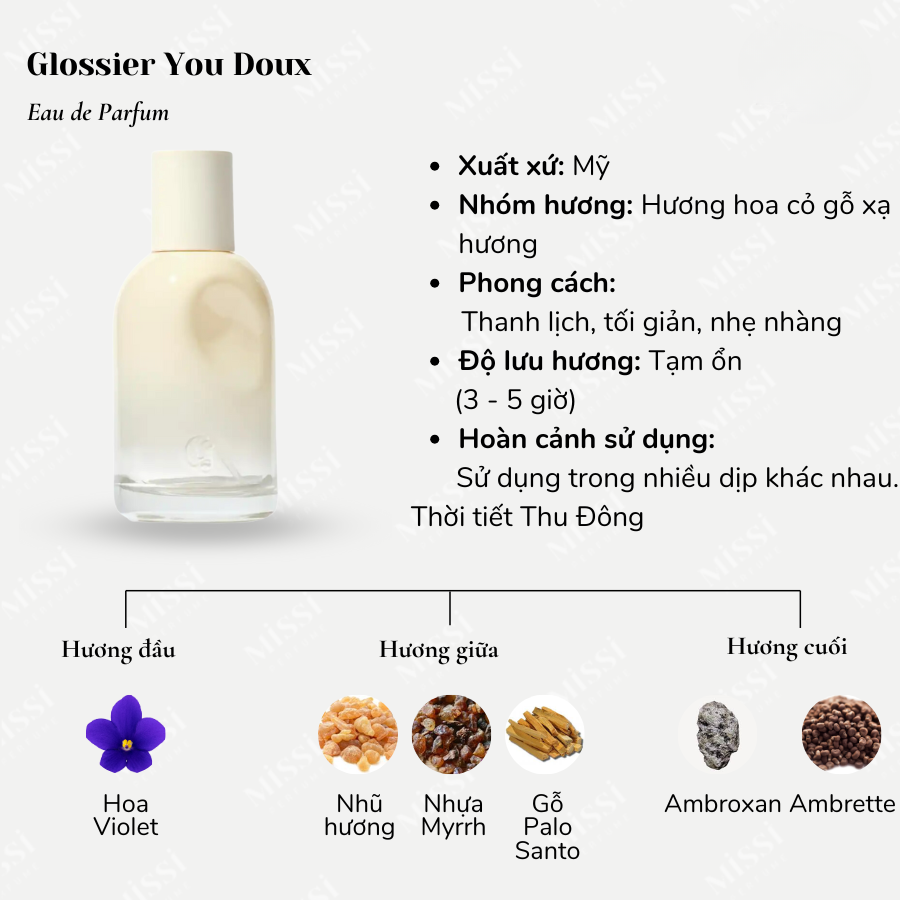 - Hương musk – iris – ambrette nhẹ nhàng